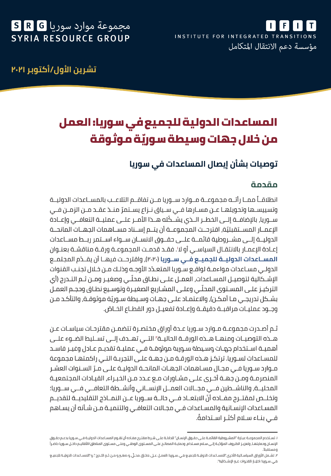 المساعدات الدولية للجميع في سوريا: العمل من خلال جهات وسيطة سوريّة موثوقة (تشرين الأول ٢٠٢١)