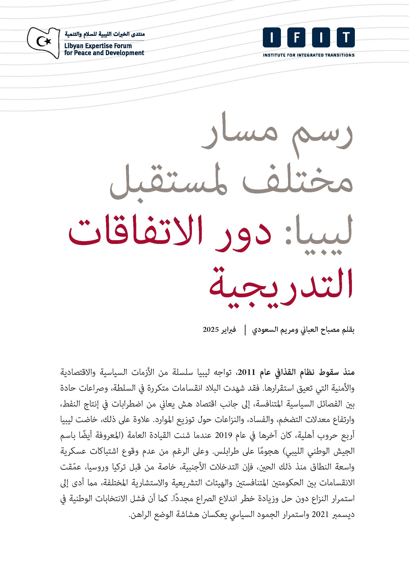 منذ سقوط نظام معمر القذافي عام 2011، تواجه ليبيا تفككًا سياسيًا، واضطرابًا اقتصاديًا، وتحديات أمنية، في حين أن المحاولات التقليدية لعقد اتفاقيات سلام شاملة لم تتمكن من معالجة الانقسامات العميقة في البلاد. تدعو هذه الورقة إلى نهج بديل: الاتفاقيات التدريجية، وهي استراتيجية تعتمد على حلول تدريجية لبناء الثقة، وتعزيز التعاون، وتحقيق الاستقرار طويل الأمد. من خلال تفكيك النزاعات الكبرى إلى اتفاقيات أصغر وأكثر قابلية للتنفيذ، يمكن لليبيا أن ترسّخ أساسًا متينًا للسلام المستدام، مما يحدّ من المخاطر المرتبطة بالتسويات السياسية واسعة النطاق، ويفسح المجال لحلول مرنة تنبع من الداخل الليبي.