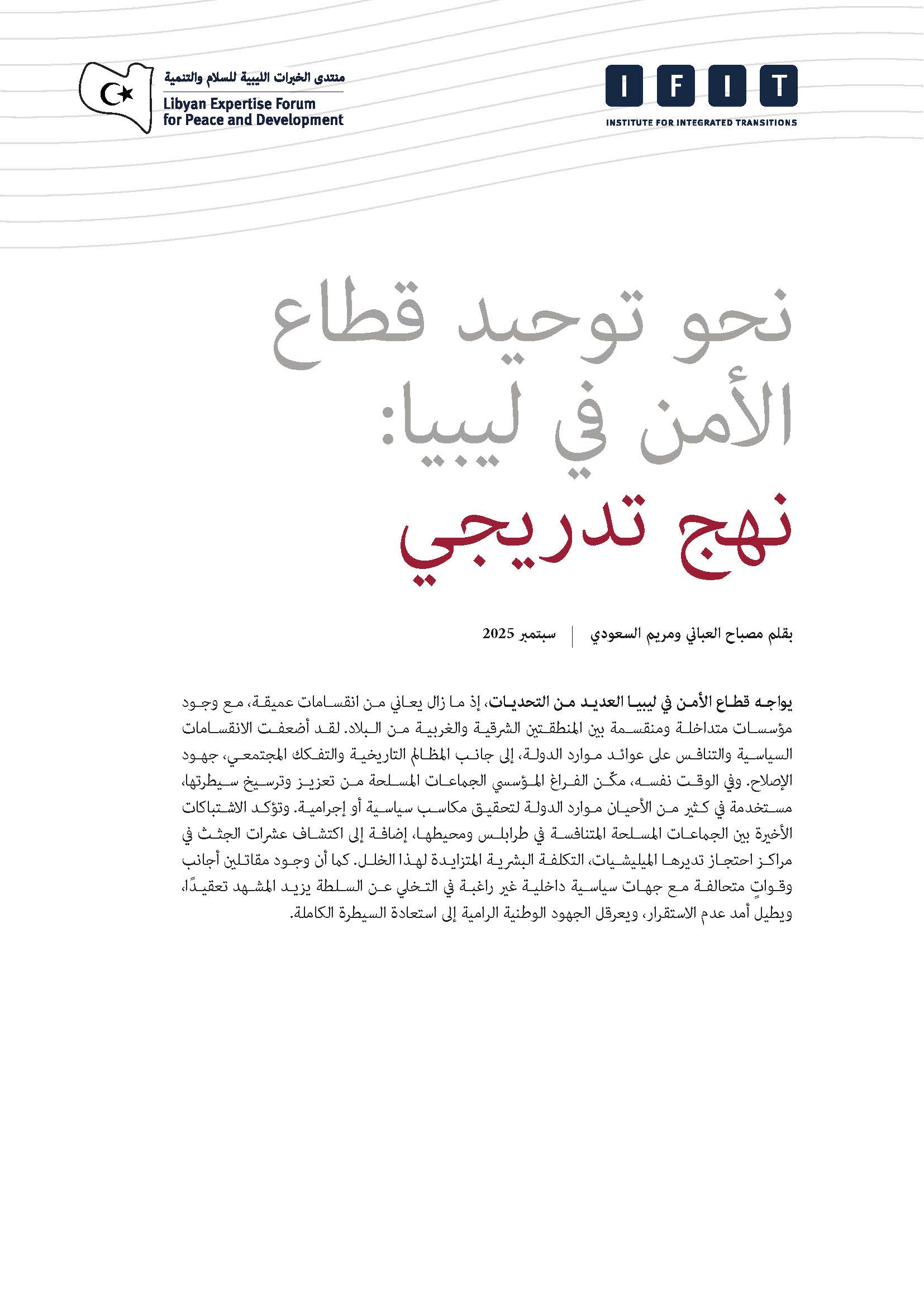 انطلاقًا من عمل مؤسسة دعم الانتقال المتكامل (IFIT) حول الاتفاقات التدريجية في ليبيا، تتناول هذه الورقة أبرز تحدٍ يواجه البلاد اليوم: دمج القطاع الأمني المنقسم. وتقترح خارطة طريق مرحلية تبدأ بخطوات لبناء الثقة على المستوى المحلي، وتتطور تدريجيًا نحو التنسيق والإصلاح على المستوى الوطني.