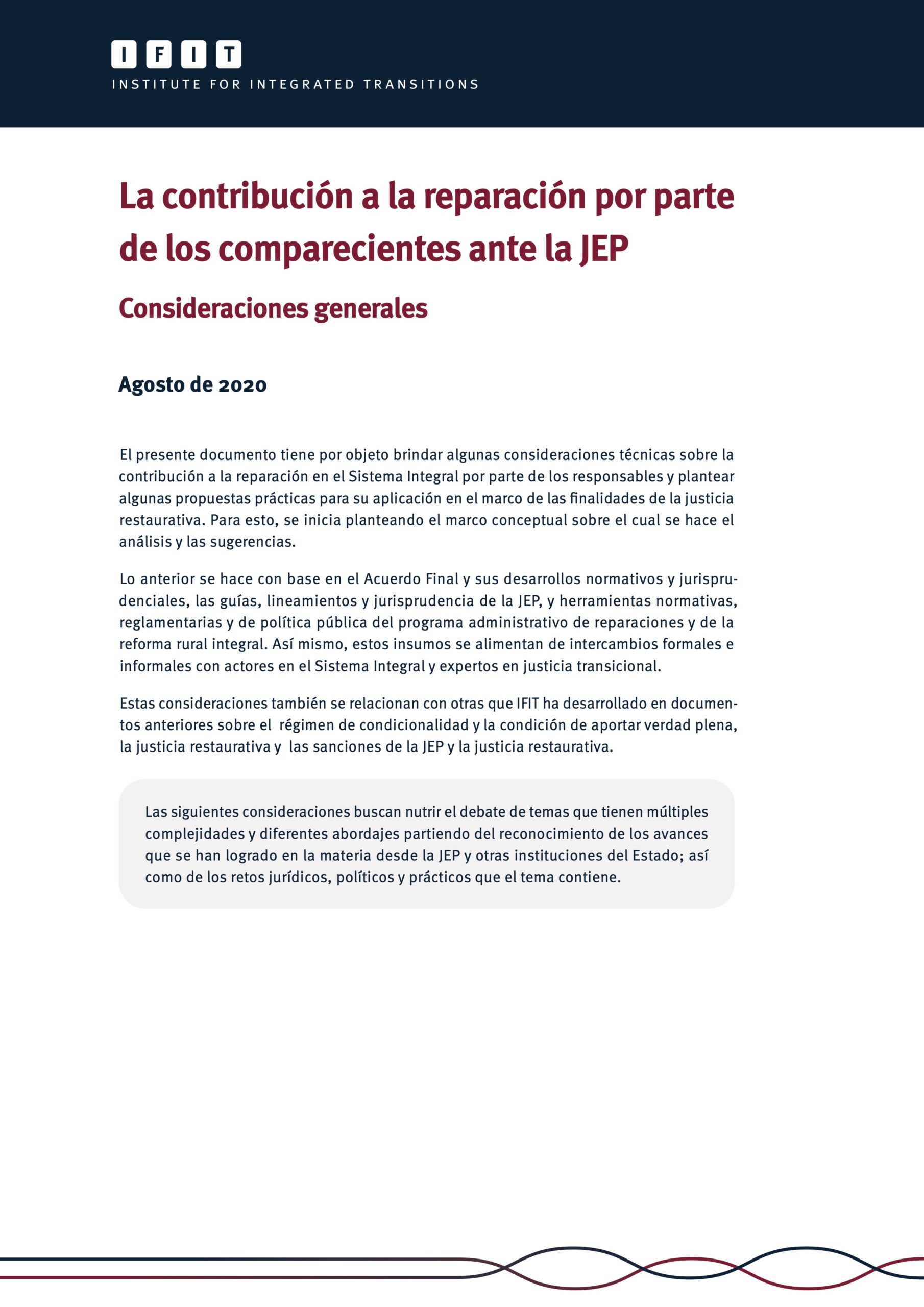 El presente documento tiene por objeto brindar algunas consideraciones técnicas sobre la contribución a la reparación en el Sistema Integral por parte de los responsables y plantear algunas propuestas prácticas para su aplicación en el marco de las finalidades de la justicia restaurativa.