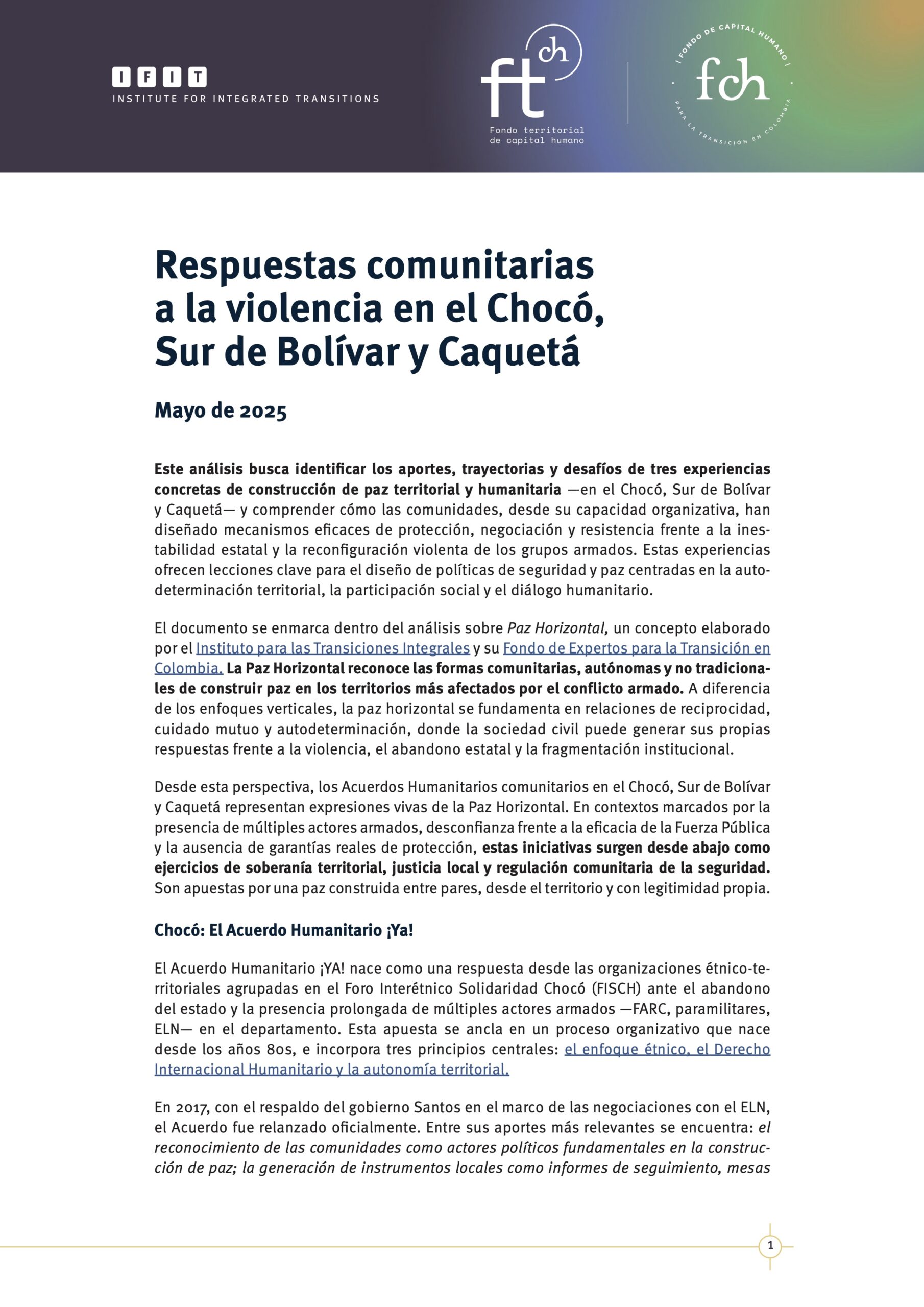 Este análisis busca identificar los aportes, trayectorias y desafíos de tres experiencias concretas de construcción de paz territorial y humanitaria —en el Chocó, Sur de Bolívar y Caquetá— y comprender cómo las comunidades, desde su capacidad organizativa, han diseñado mecanismos eficaces de protección, negociación y resistencia frente a la inestabilidad estatal y la reconfiguración violenta de los grupos armados.