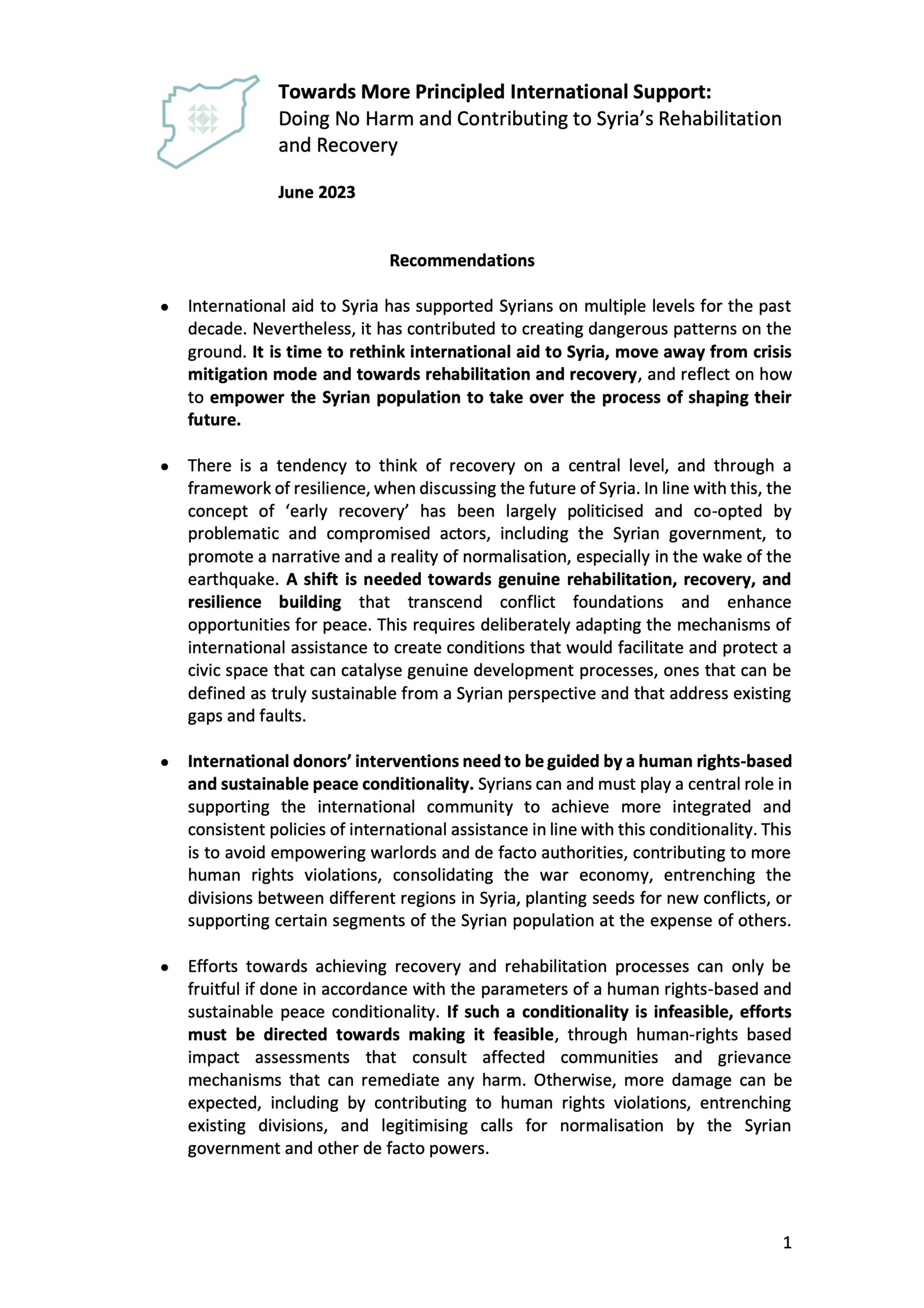 This documents outlines recommendations for providing principled international support to Syria and guaranteeing no harm is done in Syria’s rehabilitation and future recovery. Within the current political context and in the wake of the recent earthquake, it is vital to ensure an effective and sustainable response that meets the minimum needs of the Syrian people and facilitates local communities to lead their own recovery.