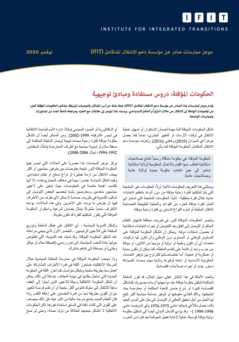 يقدم موجز الممارسات هذا الصادر عن مؤسسة دعم الانتقال المتكامل (IFIT)، توصيات عملية لصانعي السياسات حول تشكيل الحكومات المؤقتة وصلاحياتها.