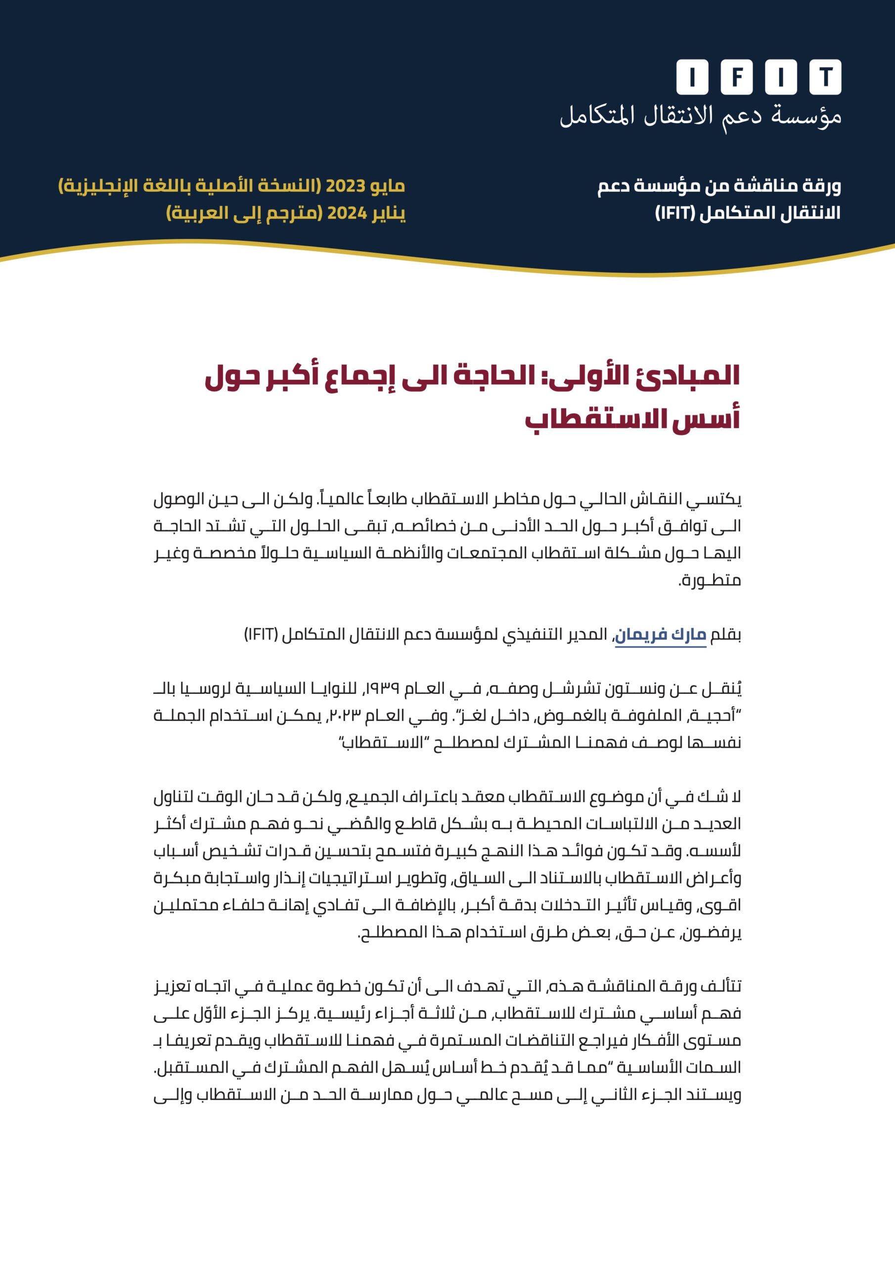 بقلم مارك فريمان – المدير التنفيذي لمؤسسة دعم الانتقال المتكامل (IFIT) – ومترجمة إلى اثنتي عشرة لغة في إطار “محادثة عالمية” روجت لها مؤسسة فورد (Ford Foundation) ومؤسسة دعم الانتقال المتكامل (IFIT) ويستند هذا النشر إلى مجموعة واسعة من التحقيقات والاستشارات التي تم إنجازها مثل جزء من مبادرة الاستقطاب العالمي.