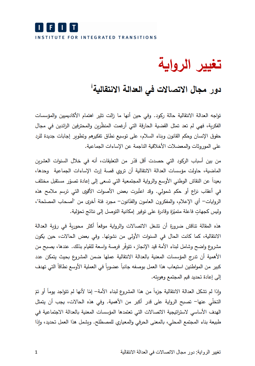 يناقش هذا الإصدار من مؤسسة دعم الانتقال المتكامل (IFIT) أهمية إيلاء الاتصالات والروايات دوراً مركزياً في رؤية العدالة الانتقالية.
