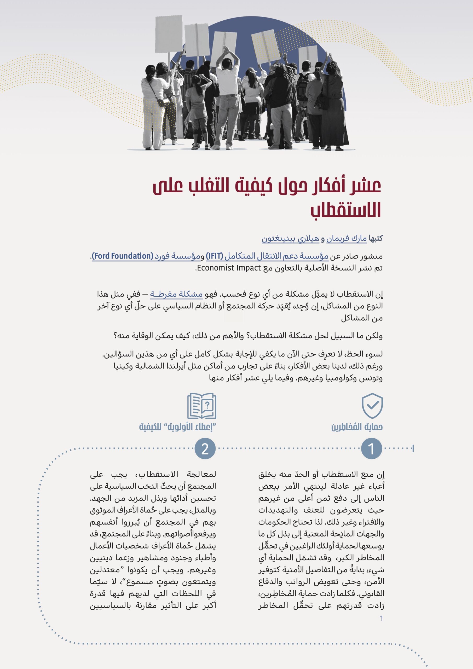 في منشور “عشر أفكار حول كيفية التغلب على الاستقطاب”، يستند مارك فريمان، مؤسس والمدير التنفيذي لمؤسسة دعم الانتقال المتكامل (IFIT)، وهيلاري بينينغتون، نائبة الرئيس التنفيذي للبرامج في مؤسسة فورد (Ford Foundation)، إلى تجارب من سياقات مثل أيرلندا الشمالية وكينيا وتونس وكولومبيا وغيرها، لتحديد عشر طرق عملية للوقاية من الاستقطاب أو الحد منه.