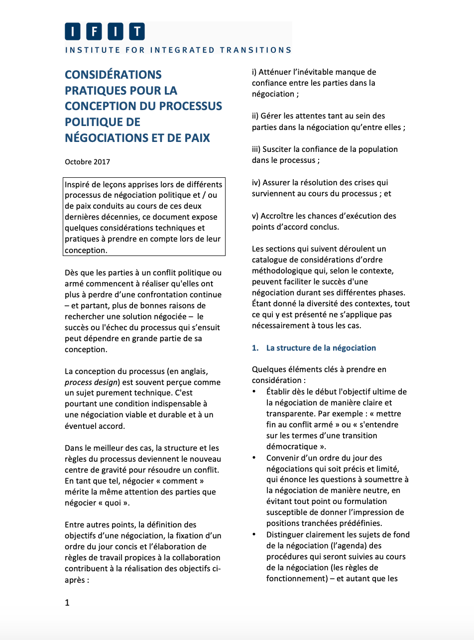 Inspiré des leçons apprises lors de différents processus de négociation politique et / ou de paix conduits au cours de ces deux dernières décennies, ce document de l’IFIT expose quelques considérations techniques et pratiques à prendre en compte pour une conception efficace de ces processus.