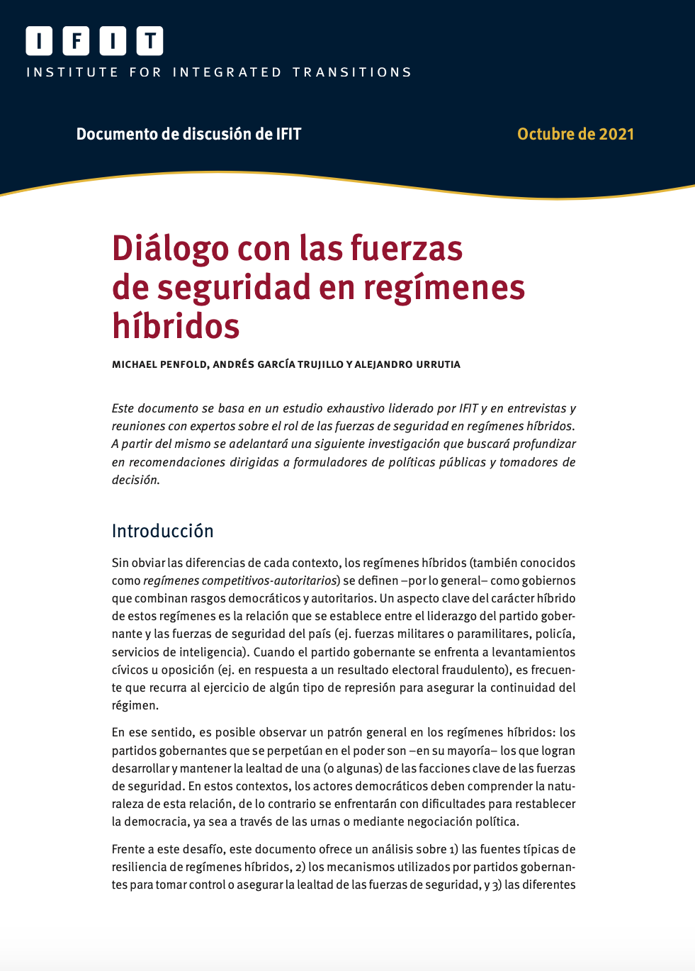 Basado en una investigación exhaustiva – que incluyó entrevistas reuniones con expertos destacados sobre el papel de las fuerzas de seguridad en los regímenes híbridos – este documento de IFIT ofrece un análisis basado en la evidencia sobre: 1) los principales factores de resiliencia de los regímenes híbridos, 2) los mecanismos que suelen utilizar los partidos en el poder para obtener el control o asegurar la lealtad de las fuerzas de seguridad, y 3) la forma en que las sectores cívicos y democráticos pueden superar los dilemas que surgen en el acercamiento con los actores del sector de la seguridad en esos contextos.