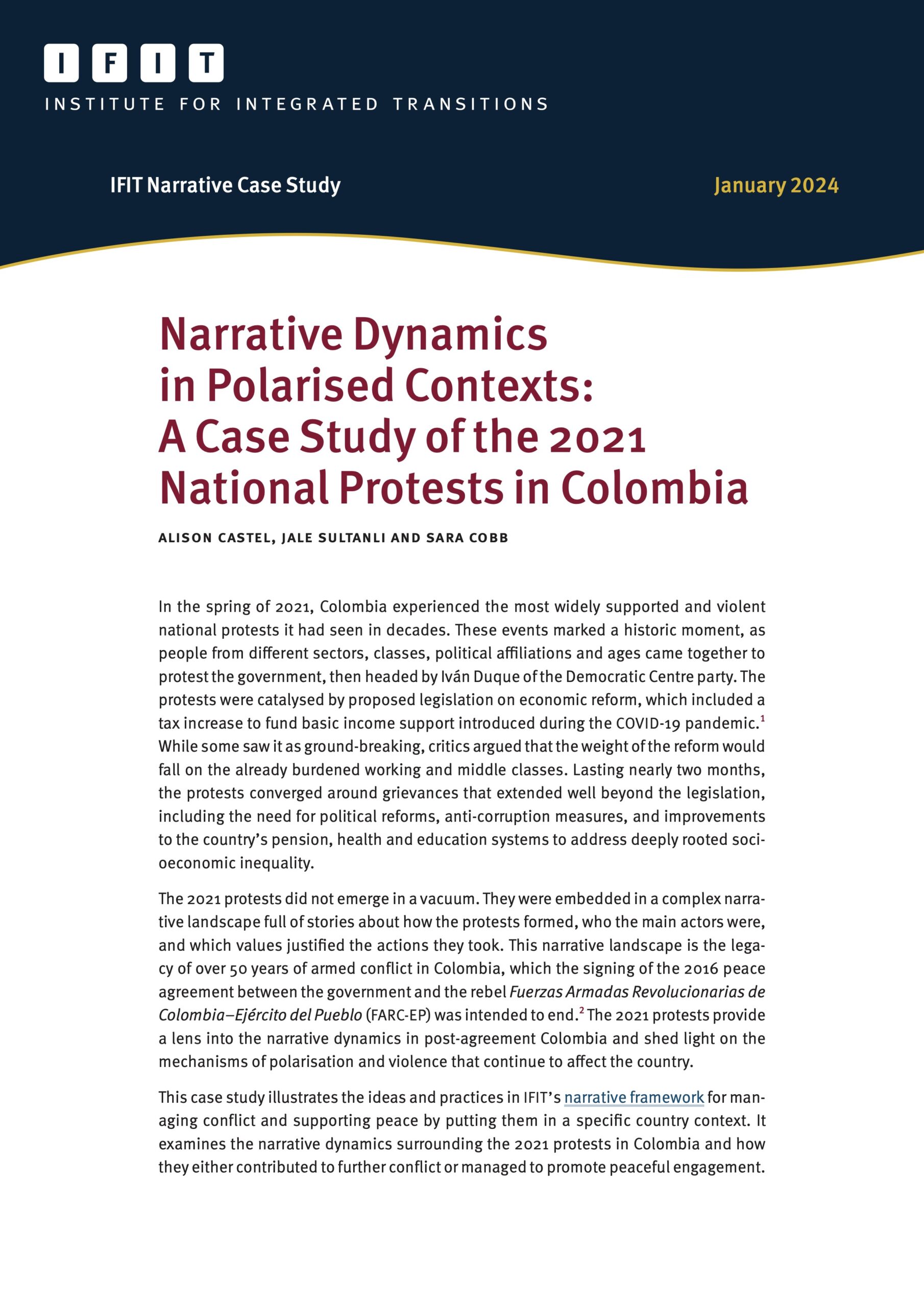 Written by Alison Castel, Jale Sultanli and Sara Cobb, this narrative case study illustrates the ideas and practices in IFIT’s narrative framework by putting them in a specific country context. In the spring of 2021, Colombia experienced the most widely supported and violent national protests it had seen in decades. The protests were embedded in a national narrative landscape full of stories about how the protests formed, who the main actors were, and which values circumscribed the actions they took. The dominant narratives were rooted in over 50 years of armed conflict in Colombia, which the 2016 peace agreement between the government and the rebel FARC-EP was intended to end.