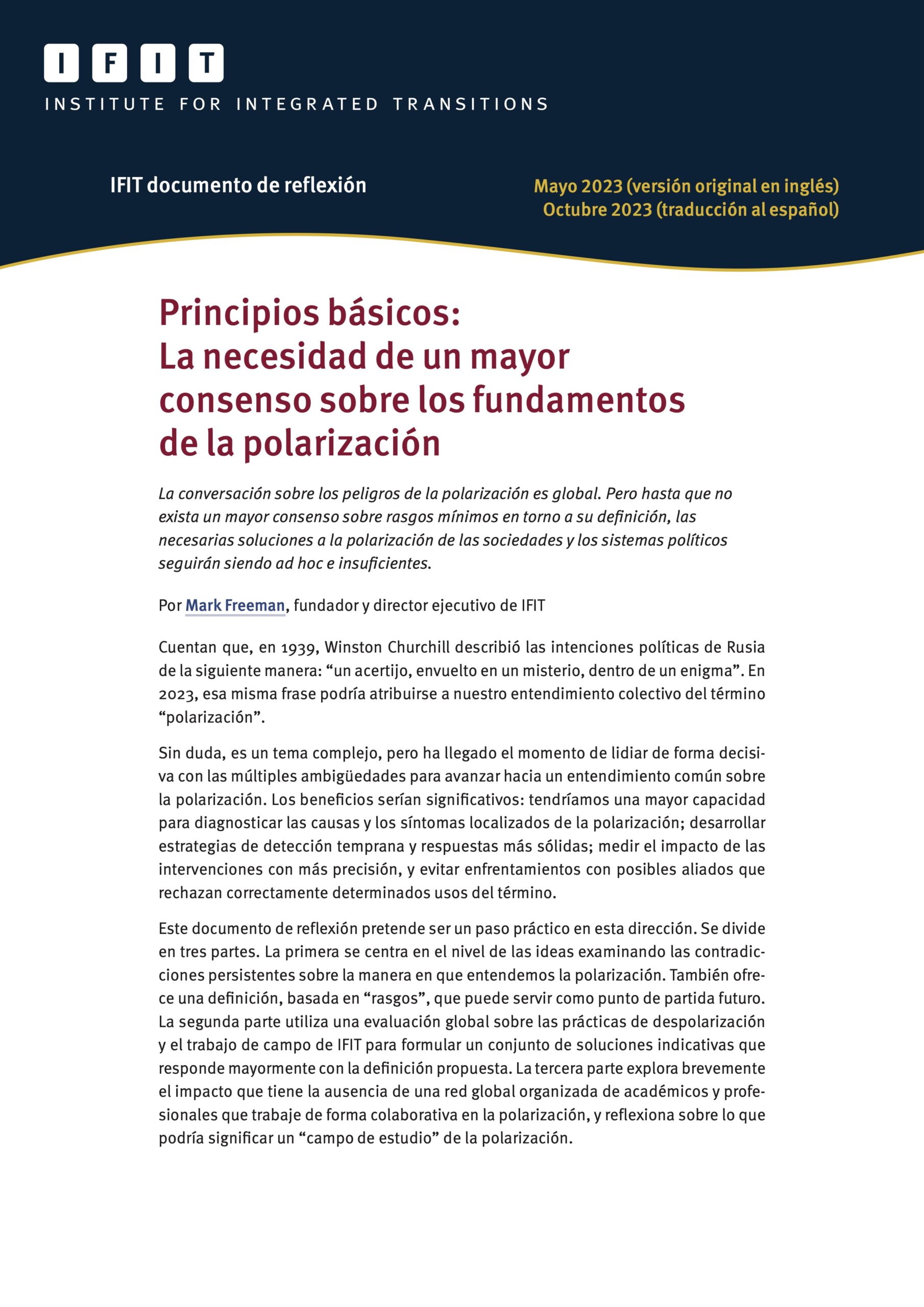 Escrita por Mark Freeman -fundador y director ejecutivo de IFIT-, y siendo traducida a doce idiomas en el marco de una “Conversación Global” promovida por la Fundación Ford e IFIT, esta publicación se basa en una amplia gama de investigaciones y consultas realizadas como parte de la Iniciativa Global de Polarización.